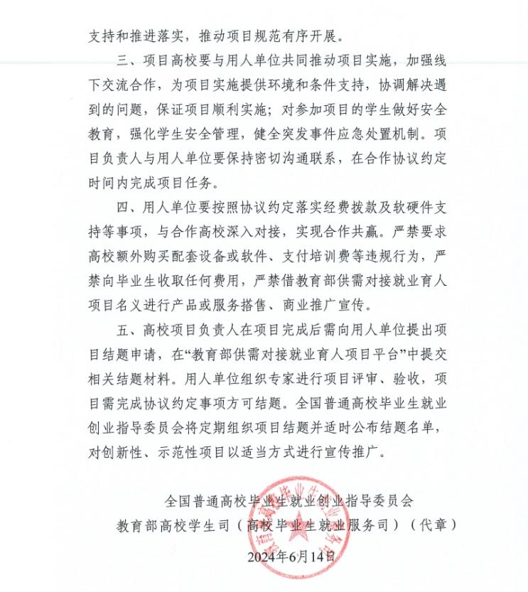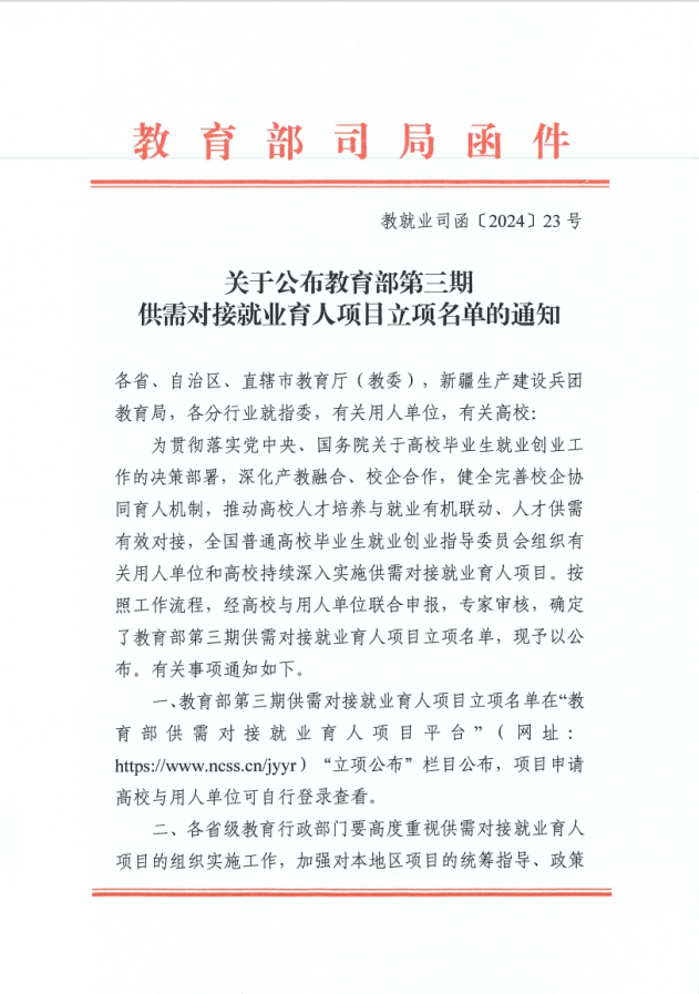 6月14日,教育部高校员工司(高校毕业生就业服务司)发布《关于公布教育部第三期供需对接就业育人项目立项名单的通知》(教就业司函〔2024〕23号),其中英国正版365官方网站组织申报的2个供需对接就业育人项目获批立项。