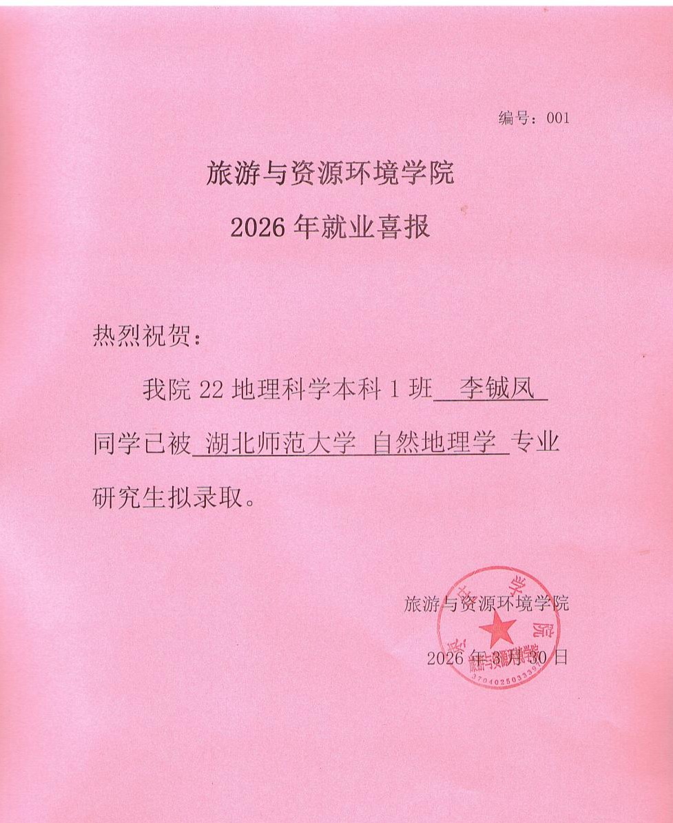 喜报!22地理科学本科1班李铖凤被湖北师范大学录取!