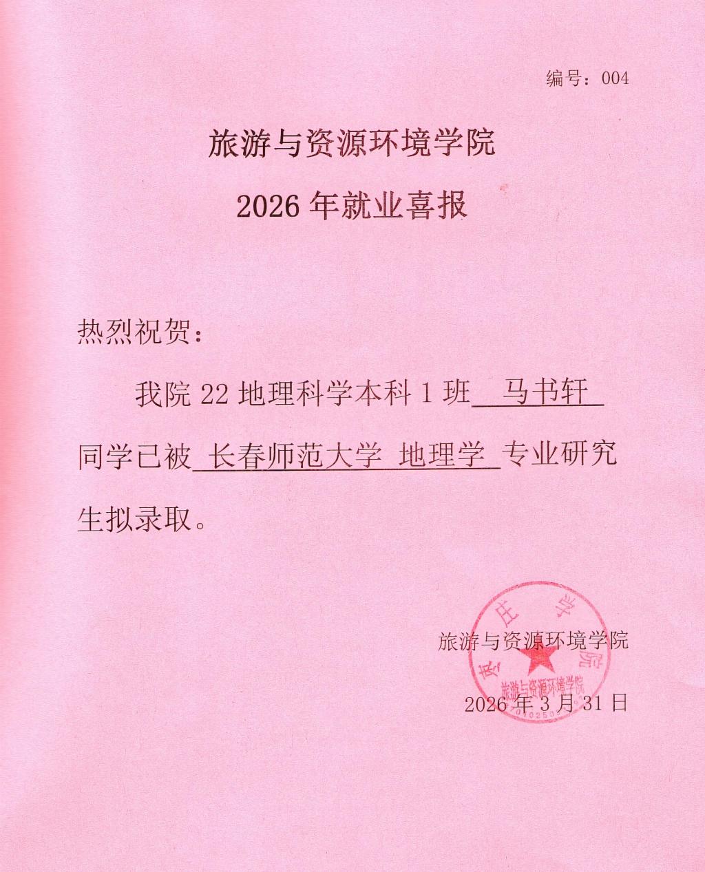 喜报!22地理科学本科1班马书轩被长春师范大学录取!