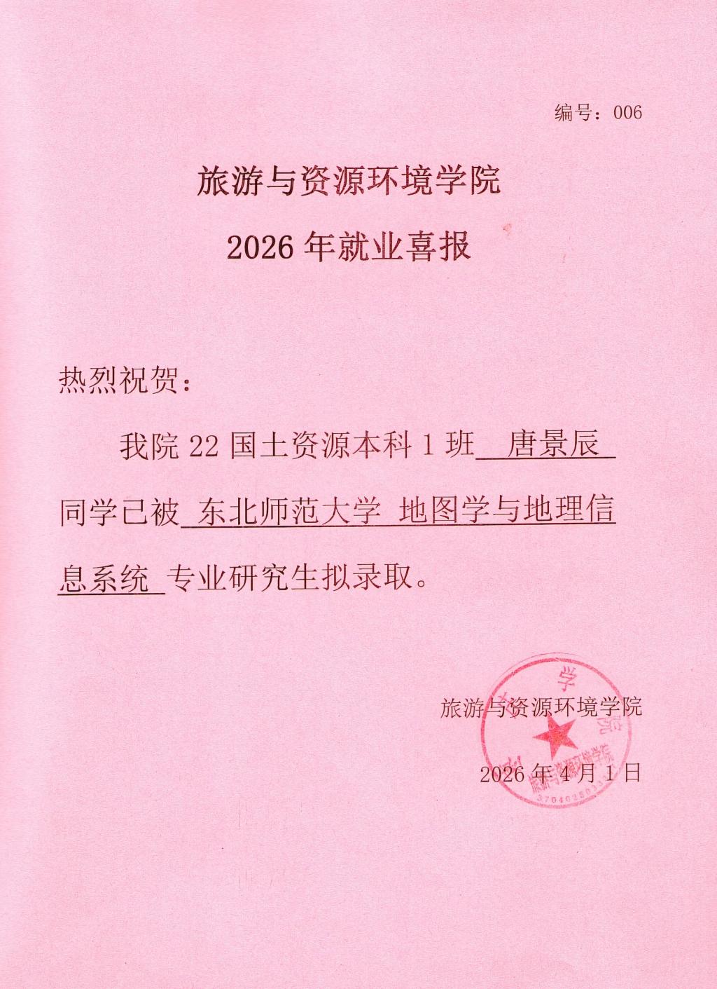 喜报!22国土资源本科1班唐景辰被东北师范大学录取!