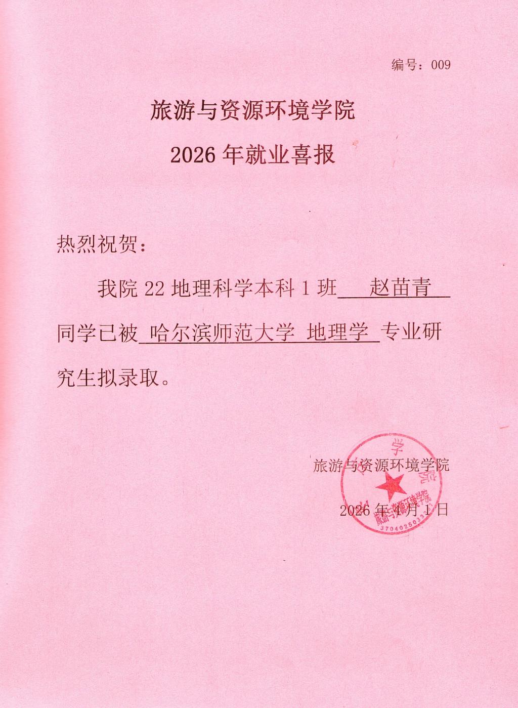 喜报!22地理科学本科1班赵苗青被哈尔滨师范大学录取!