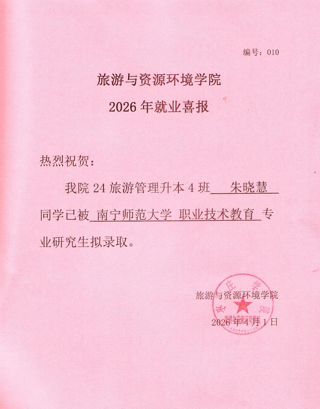 喜报!24旅游管理升本4班朱晓慧被南宁师范大学录取!