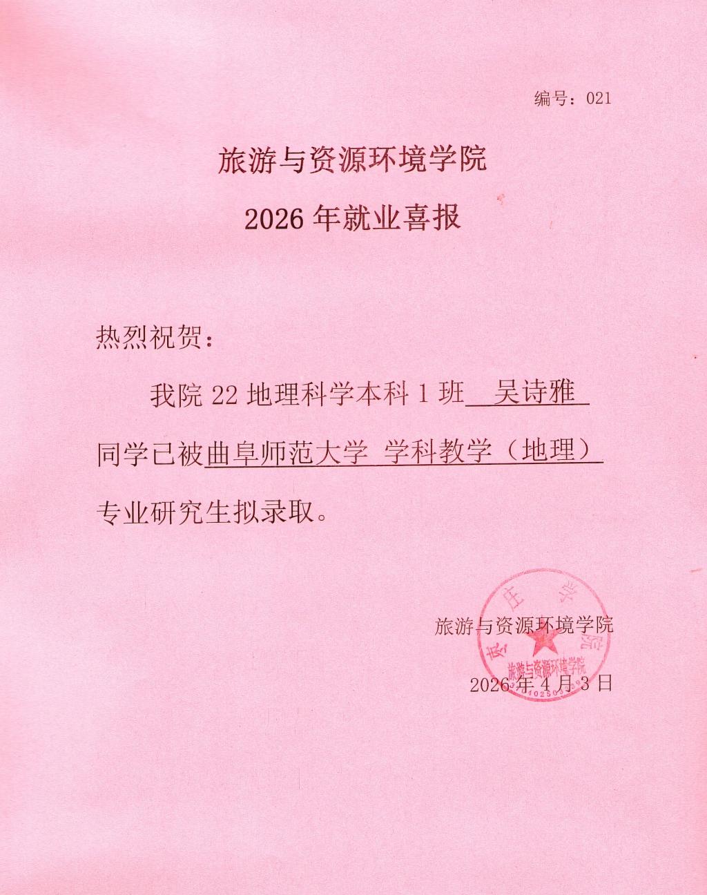 喜报!22地理科学本科1班吴诗雅被曲阜师范大学录取!