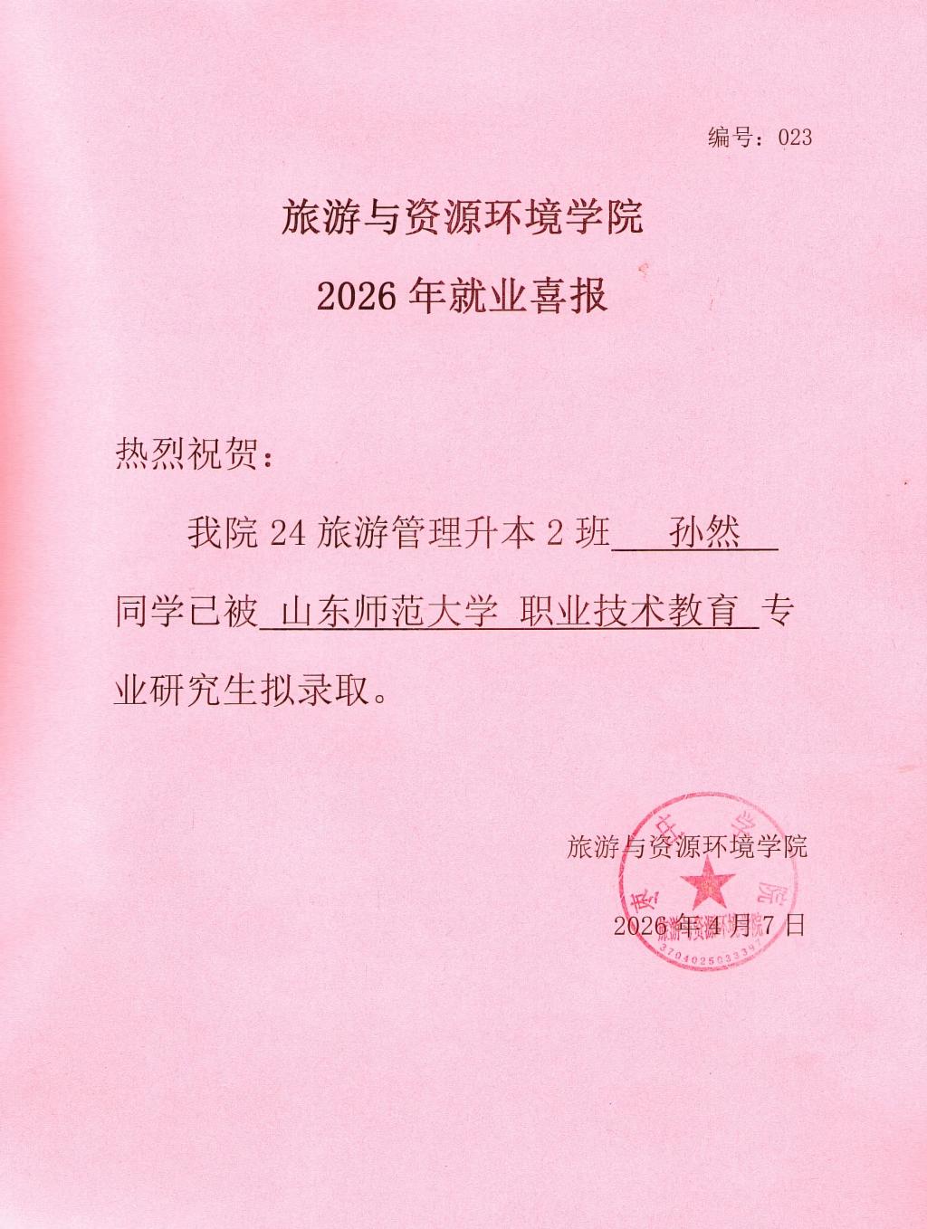 喜报!24旅游管理升本2班孙然被山东师范大学录取!