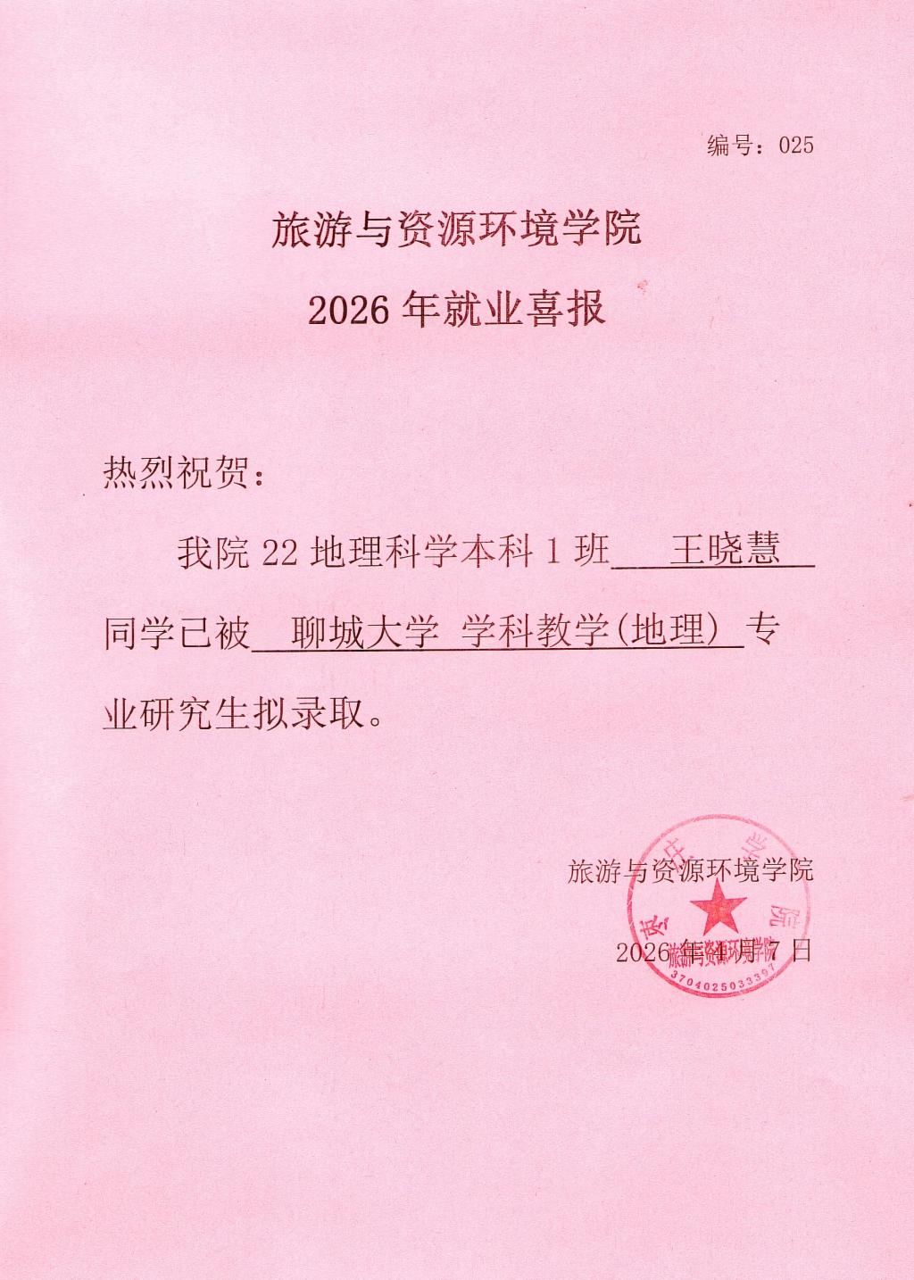 喜报!22地理科学本科1班王晓慧被聊城大学录取!