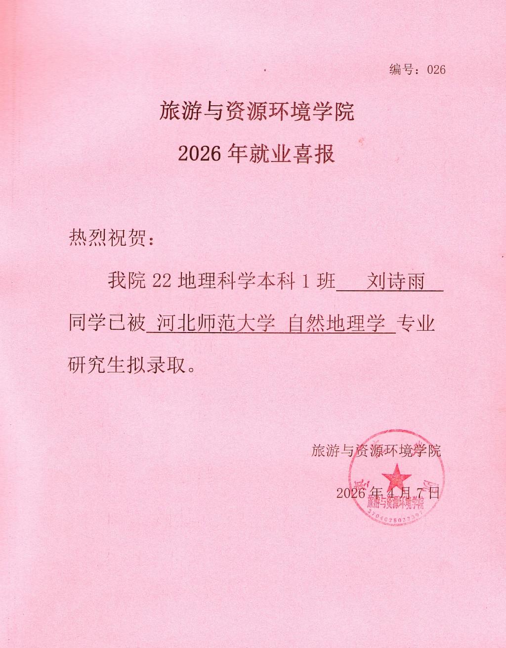 喜报!22地理科学本科1班刘诗雨被河北师范大学录取!