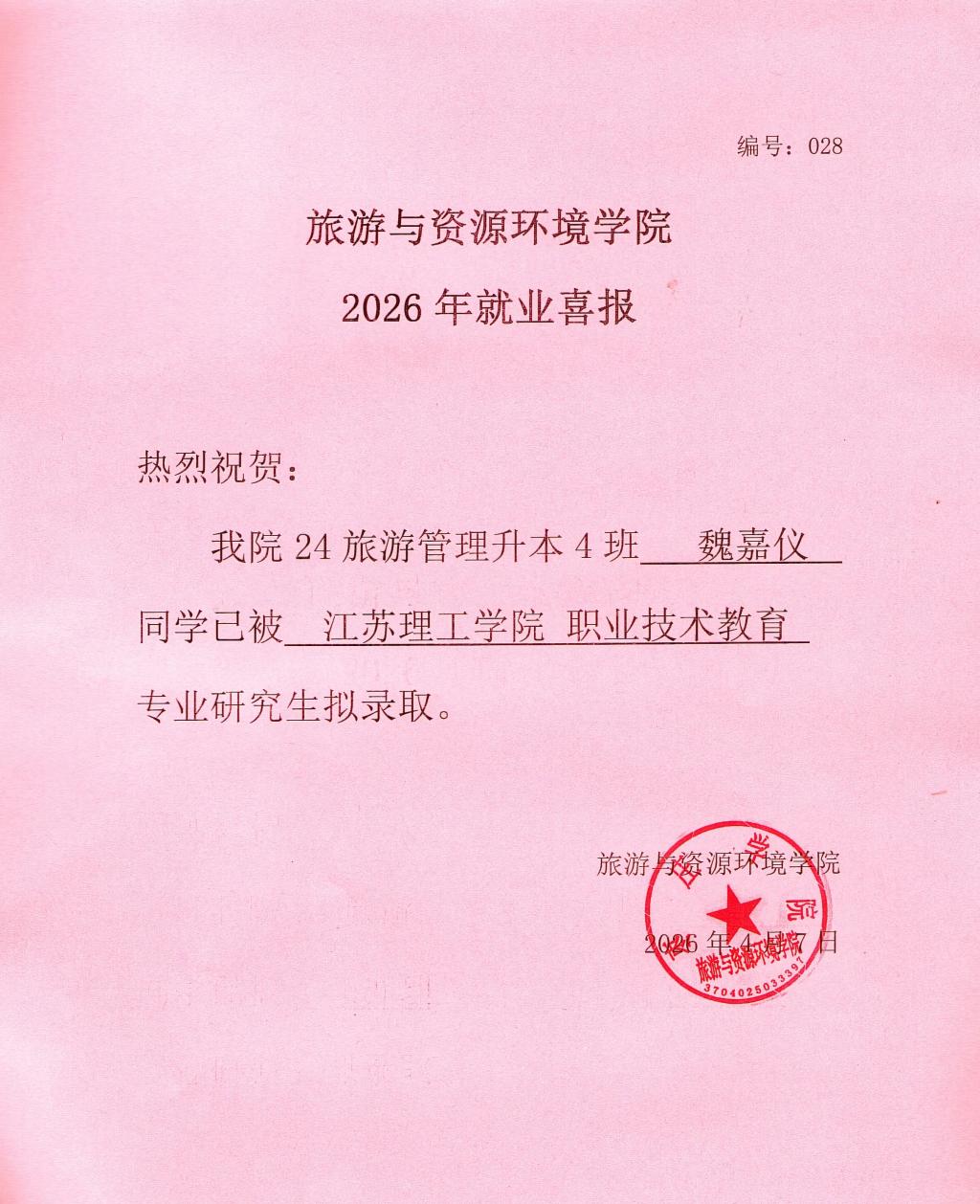 喜报!24旅游管理升本4班魏嘉仪被江苏理工英国正版365官方网站录取!