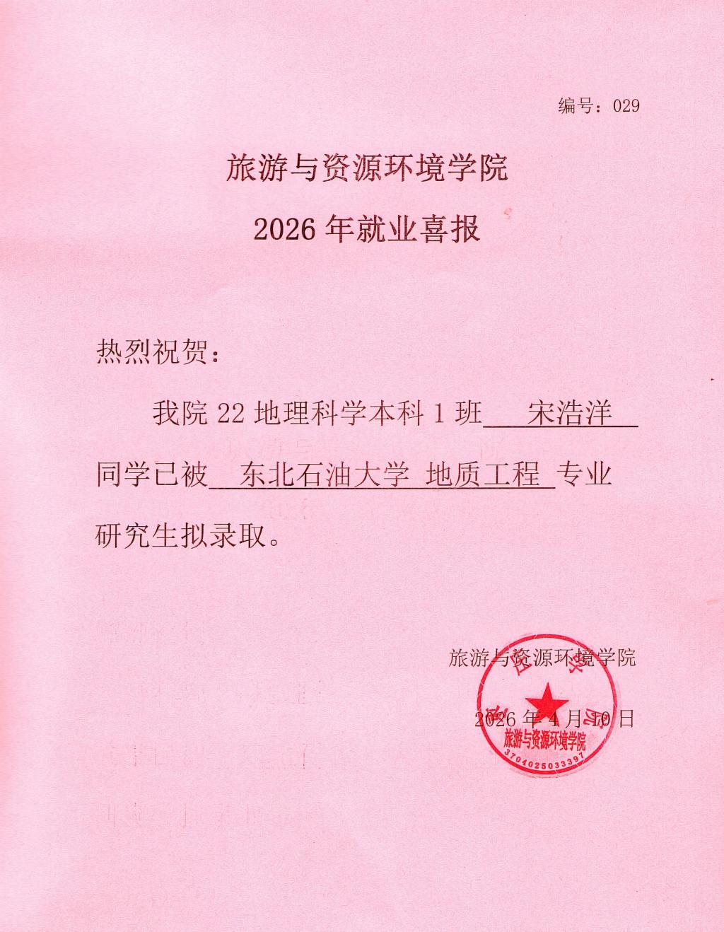 喜报!22地理科学本科1班宋浩洋被东北石油大学录取!